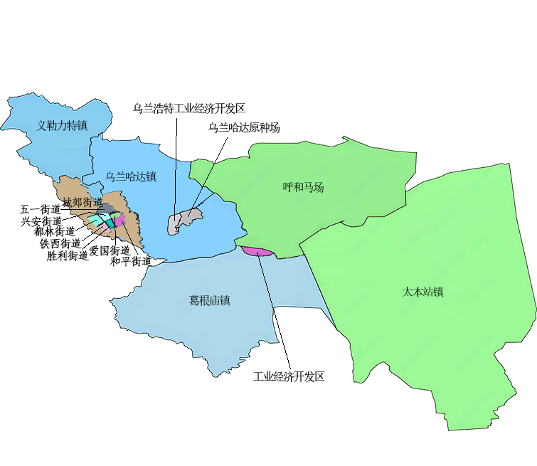 乌兰浩特市位于内蒙古自治区东北部,兴安盟东南部,东与扎赉特旗、吉林省镇赉县毗邻,南与吉林省白城市洮北区、洮南市接壤,西南与吉林省洮南市相连,西、北与科尔沁右翼前旗相邻。地处大兴安岭山脉的中段与松辽平原过渡地带,属低山丘陵地貌。总面积2353.5平方千米。境内矿产资源主要有萤石、石灰石、建筑用沙石、砂质黏土;建筑用岩石分布广泛。乌兰浩特市林业用地68113公顷,森林覆盖率26.6%,活立木蓄积824534立方米,用材林面积13639公顷。全市林木蓄积量586736立方米,占活立木总蓄积量的71.2%。辖4个建制镇,11个街道办事处,39个嘎查,19个村,59个社区居民委员会(不包括呼和马场、公主陵牧?。?。2023年,地区生产总值2232803.0万元,按可比价计算,同比增长6%。其中,第一产业154701.0万元,同比增长5.7%;第二产业1008435.0万元,同比增长4.1%;第三产业1069667.0万元,同比增长7.6%。